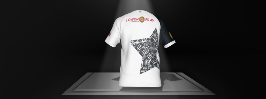 Doch es sind die Details, die dieses Trikot zu einem wahren Kunstwerk machen. Die asymmetrischen Muster, die sich wie Blitze über die Front ziehen, verleihen dem Design eine explosive Energie. Auf der Rückseite setzt sich der Stern eindrucksvoll in Szene, begleitet vom Platzhalter-Schriftzug „CORNSTARS“, der später durch die Namen der Spieler ersetzt wird. So erhält jedes Trikot eine individuelle Note, die die Einzigartigkeit jedes Teammitglieds unterstreicht. Die Logos der Sponsoren, wie das markante „LÖWEN PLAY“ auf dem Rücken, fügen sich harmonisch ins Gesamtbild ein und unterstreichen den professionellen Anspruch des Teams.