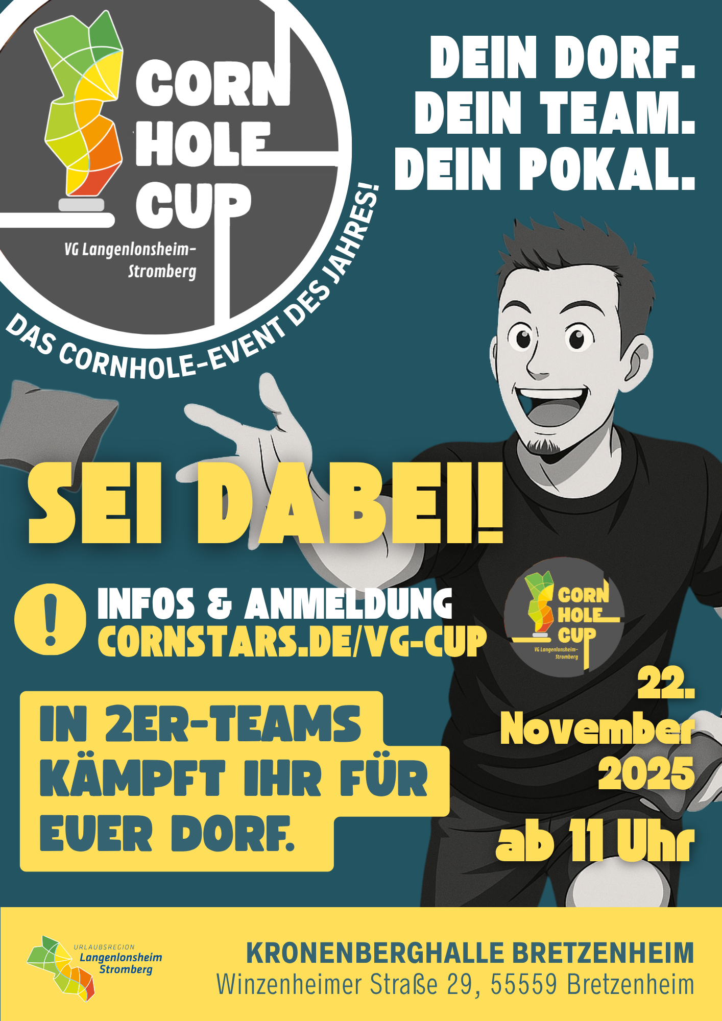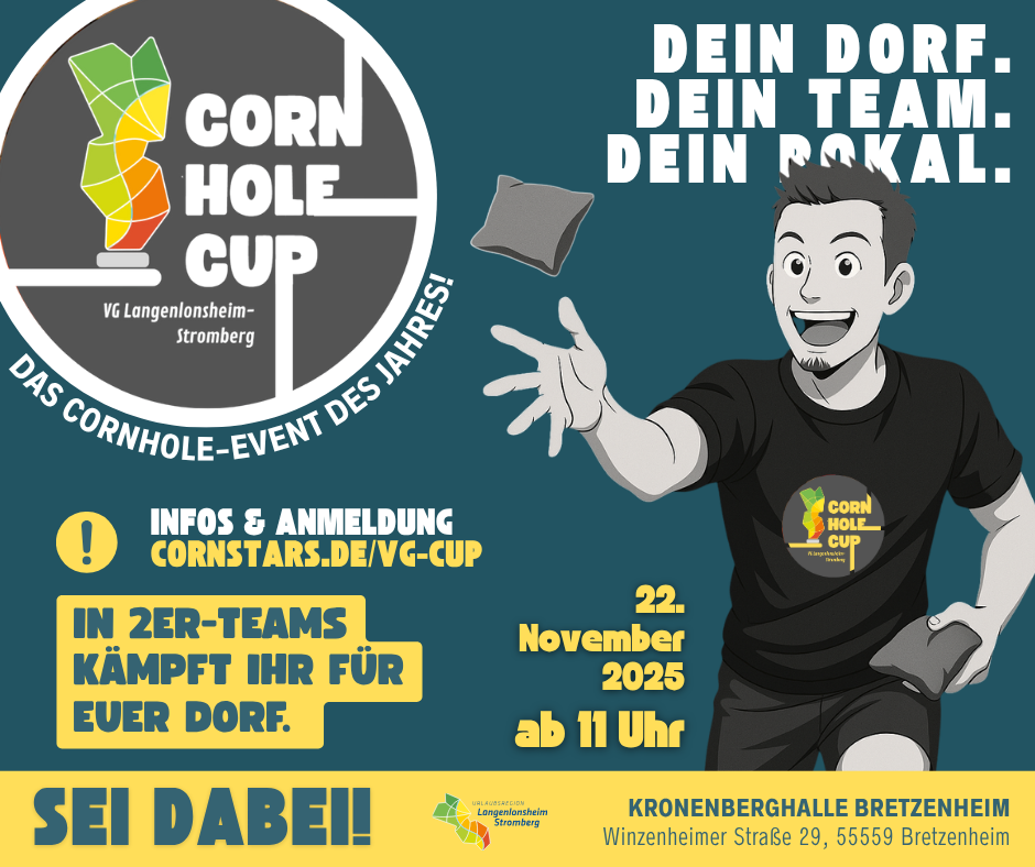 Am Samstag, 22. November 2025, steigt in der Kronenberghalle Bretzenheim der erste VG Cornhole Cup! Zum allerersten Mal treten Teams aus den 17 Ortsgemeinden und ein Team der Verwaltung der Verbandsgemeinde Langenlonsheim-Stromberg gegeneinander an – und kämpfen um den großen VG-Pokal.